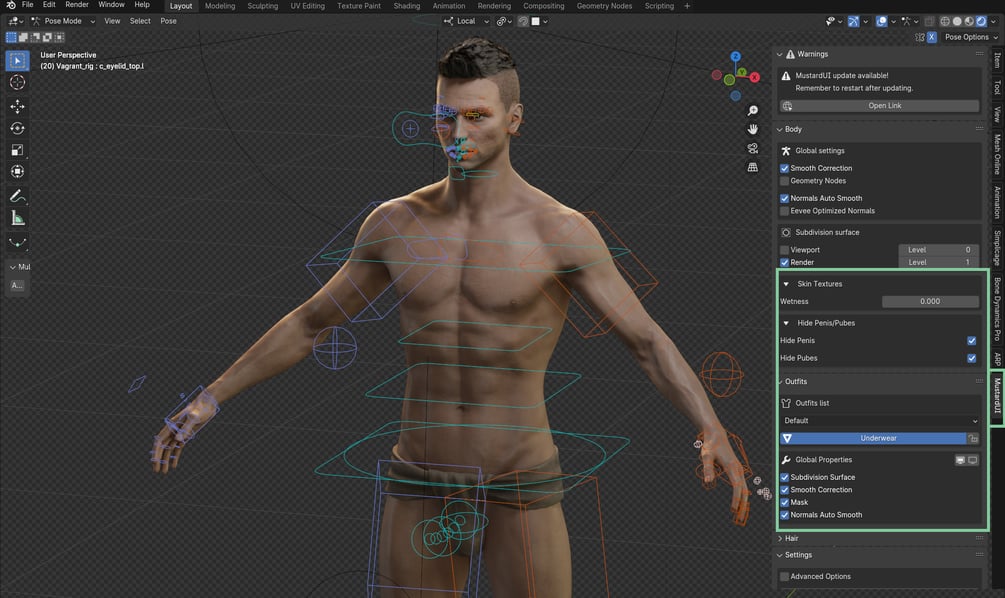 He is fully rigged with AutoRig Pro rig and have ARKit shapekeys for facial mocap. Along with simple MustardUI setup for toggle on/off underwear and sweat textures.
